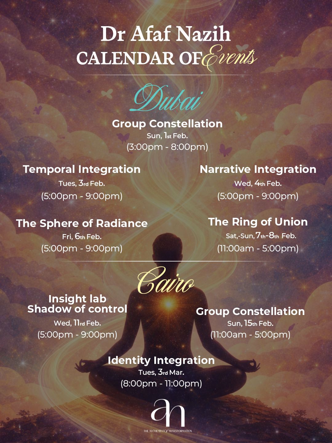 "Dr. Afaf has a profound sense of sincerity and integrity. Her gift of seeing beyond the ordinary together with her intention to fully serve allows her to be an extraordinary family constellations facilitator. She holds a space of strength and love which enables phenomenal resolve to take place. "